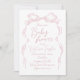 Os convites para bebês elegantes apresentam um arco de fita desenhado manualmente com fontes modernas de script manuscritas em rosa pincelado e suave. doce e simples. Excelente para chá de fraldas caprichoso único. Veja todas as peças correspondentes na coleção.