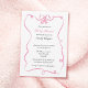 Este Chá de fraldas moderno e delicado é perfeito para a mãe estar esperando uma menina. Ele apresenta uma ilustração do estilo caligrafia de um arco e fitas que se transformam em um quadro. Esta design de tendências é moderna e clássica. Ele combina com suprimentos sólidos de partes brancas e cor-de-rosa para um evento tenro e na moda.