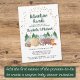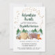 Doce chá de fraldas rústico, com uma ilustração fofinha de animais florestais com sua tenda acampando nas montanhas e na floresta, uma camada de estrelas de ouro e "Aguardas de Aventura" e o nome da futura mãe em um roteiro verde de caçador negro. Personalize facilmente os detalhes do chá.