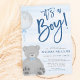 Um convite para chás de fraldas de ursos de cinza bonitos. O urso de pelúcia está vestindo uma gravata arco e segurando um balão. Design apresenta um fundo azul claro de aquarela com uma fonte moderna de script de caligrafia. Contate o designer se precisar de ajuda para adicionar suas informações.