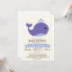 Cute Purple Baby Whale neutra, ou convite para chá de fraldas. Personalize este convite bonito e retrógrado; pode ser para chá de fraldas de menino ou de menina ou pode ser trocado para o borrifo de bebê. Bela, simples, design simples. Possui baleia bebê roxa, fita de lavanda e corações. Excelente para baleia, praia, litoral, náutico, chá de fraldas do tema oceânico ou borrão!