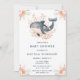 Um belo convite de chá de fraldas apresenta uma baleia com arranjos florais cor-de-rosa coral. Perfeito para um chá de fraldas. As palavras podem ser alteradas para se adequarem aos seus próprios detalhes ou requisitos