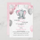 Este adorável convite para chás de fraldas apresenta elefante de menina rosa e cinza com balões e confete. A parte traseira apresenta uma aquarela rosa macia. Facilmente personalizado para seu evento clicando em personalizar.