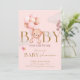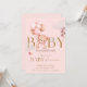Um convite de chá de fraldas cor-de-rosa com um ursinho de pelúcia rosa e balões cor-de-rosa para uma menina.
