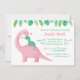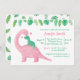 Convidem convidados para comemorar com a mãe para estarem com este convite temático de dinossauro bonito que apresenta uma mãe de dinossauro rosa com um bebê dinossauro verde nas costas. Folhas tropicais para decoração. Personalize com seus detalhes de chá de fraldas nas modelos de texto fornecidas.