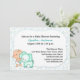 Um doce convite para um chá de fraldas com um bebê bonitinho e elefante com fundo azul e abstrato verde.