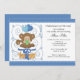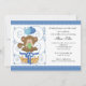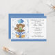 Convite Para Chá De Um Macaco Bonito. Design apresenta o macaco bebê mais bonito em uma cesta com um arco azul e balões azuis. Correspondência de selos e autocolantes disponíveis em nosso compro