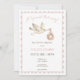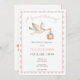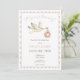 Bem-vindos a um pequeno com encanto de feitiço e zangão. Nosso convite de chá de fraldas encantador apresenta o carregando de cegonha-d'água, seu pacote de precioso, com o título "entrega especial". Um bebê dormindo boia em uma fita rosa cercada por duas pombas destaca o dorso. Pinks suaves, cremes e cinzentos criam uma sensação quente de um livro de histórias sobre um fundo branco nítido. Perfeito por comemorar com um toque de capricho e maravilha! Criado pela imprensa simplesmente de farmácia.