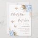 Blue Boho Floral Butterfly Kisses Chá de fraldas Convite para beijos modernos de borboletas e bebês desejam um convite para chá de fraldas com dois arranjos florais secos estilo boêmio com grama-pampas, rosas azuis e folhas de palma. O design também apresenta três borboletas falsas de glitter rosa-ouro e um moderno título de letra de caligrafia monofline.
