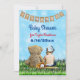Bebê e ursinho bonitos com boné de beisebol, luva de baseball e beisebol e taco sentados juntos na grama por um campo de beisebol. Este é um tema fofo para o chá de fraldas de um menino no primavera ou verão.