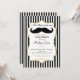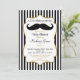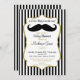 Um convite elegante para o chá de fraldas de bigode preto e dourado, com falso quadro de sotaque dourado e listras pretas e brancas com texto dourado e preto e um bigode preto divertido. Este convite para chás de fraldas de rapaz elegante é apenas o bilhete.