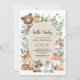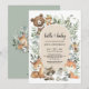 Este elegante convite para chás de fraldas apresenta um moderno arco de boho adorado com água doce verde macia e animais adoráveis da floresta. Adequado para chá de fraldas de menino e de menina.
