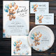 Um belo chá de fraldas de ursos de pelúcia com convite de azuis e castanhos, perfeito para um menino. No coração do design está um ursinho de pelúcia bonito segurando balões coloridos, o texto "Nós podemos esperar mais cedo" e sotaques florais brancos de vassoura.