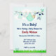 Chá de fraldas para um rapaz ou uma rapariga, neutro em termos de gênero. Tudo em tons de verde com este cartão de convite. Um cartão engraçado com as roupas na linha e um bebê. Substitua as informações por suas. A parte traseira desta placa plana tem faixas verdes diagonais em um design retrovisor de tendência.