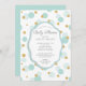 O convite para chá de fraldas bonito com pontos azuis e dourados é definido em um fundo branco com um fundo azul de coordenação para um toque especial extra.