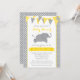 Convites de chá de bebê de elefante, amarelo-giro e cinza. Este convite para chás de fraldas divertidos apresenta uma faixa amarela e cinza para bunting, uma pequena ilustração de elefante para bebês e bolinhas. Perfeito para um rapaz ou chá de fraldas neutro em termos de gênero.