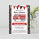 Chamada de chá de bebê com tema. Este convite para chás de fraldas apresenta uma faixa vermelha, cinza e bunting preto, uma ilustração e bolinhas de um caminhão de incêndio vermelho.