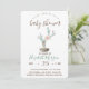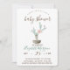 Convites de chá de bebê bonitos com cactos de aquarela no topo com bolinhas verdes.