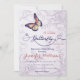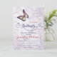 Texto manuscrito único "uma borboleta pequena está a caminho!" decorado com borboletas de aquarelas em lilás roxo e cor-de-rosa pincelada Modelo de Convite de Chá de fraldas Imporal que você também pode personalizar para um Convite de aniversário. Veja mais suprimentos de festas na coleção da minha loja PatternDigitPics.