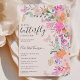 Uma borboleta está a caminho! Flores silvestres românticas pastéis chás de fraldas de verão com bonito flores selvagens de campo com borboletas pintadas à mão de golfe em cores pastel e flores em rosa, pêssego, roxo, lavanda, folhas verdes e muito mais, com uma tipografia com script escovado em um elegante e editado fundo rosa pastel macio.