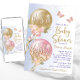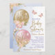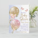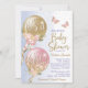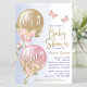 Chá de fraldas rosa. roxo e dourado convite com balões bonito cor-de-rosa e dourados com flores, borboletas e arcos sobre fundo branco e roxo de lavanda. Este convite para chás de fraldas roxo, cor-de-rosa, ouro e lavanda é facilmente personalizado com os detalhes do evento.