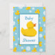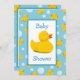 Estes convites adoráveis são perfeitos para comemorar chás de fraldas com um tema ducky de borracha! Características de design um fundo azul com um teste padrão aleatório de duckies e da luz de borracha amarelos - bolhas de sabão azuis. No centro do design ducky rubbery é uma área retangular branca com um pato de borracha grande, amarelo no centro. Acima e abaixo do ducky de borracha é o texto no azul que diz o chá de fraldas, porém este pode ser mudado para serir suas necessidades. O verso tem o mesmo fundo ducky azul e de borracha com uma área branca contínua maior para seu próprio texto personalizado na pia batismal azul!