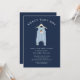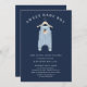 Adoráveis rapazes, convite para o chá de fraldas, com um corante azul com um urso doce sobre o cabide, colocado sobre um fundo azul escuro. Sacudir o nosso belo convite para ver um par de botas para um toque especial extra.