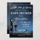 Este convite para Chás de fraldas apresenta e caldeirão com o texto "uma bruxa está se formando". É perfeito para chá de fraldas de menina. Ele também tem uma ilustração de um com pote. O fundo está em cor azul com cemitério no fundo. Todo o texto é personalizável. As fontes estão em branco.