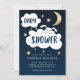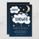 Cartão de convite para chá de fraldas doce para sua lua e estrelas festa temerária! Ilustração de nuvens com um coelho espiando sua cabeça de um deles. Há textos dentro das nuvens que dizem "chá de fraldas". Há lua brilhante dourada e estrelas num fundo azul marinho escuro. A seguir, as informações da parte chá de fraldas. Os textos são facilmente personalizáveis online. Este convite foi desenhado para um chá de bebê. Ilustração e design do Namibear Art Studio. ©Namibear