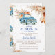 Rustic Wildflower Blue Pumpkin Truck Chá de fraldas Convite para folhagem de outono do Boy e flores silvestres de abóbora convite para chá de fraldas com um caminhão azul escuro e abóboras azuis e laranja claras. Este convite para chás de fraldas de abóbora é ideal para o chá de fraldas de outono de um menino.