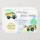 Pontos de confete suaves, verdes e amarelos e veículos de construção divertidos, convite para chás de fraldas. Alterar e adicionar texto conforme preferido. O caminhão de lixo azul e amarelo e a traseira de alto elevador são uma maneira perfeita de avisar os hóspedes que é uma chá para um menino.