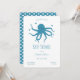 Um convite chá de fraldas com um polvo azul, bonito, com corações azuis em fundo branco. As palavras estão em uma fonte aberta e relaxada em tons de azul. O verso do convite mostra um padrão de corações brancos em um fundo azul. Todas as palavras podem ser personalizadas.