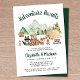 Chá de fraldas de casais rústicos doces que apresenta uma ilustração fofa de animais florestais (ursos, raposa e guaxinim) com sua tenda e acampamento nas montanhas e florestas e "Aventura Aguarda" e os nomes da mãe e do pai em um roteiro verde-escuro.
