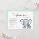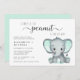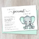 Um convite para chás de fraldas bonitinho, neutro em relação ao gênero, com "A Sweet Little Peanut Is On its Way" na tipografia de cinzas moles e um roteiro de 'swash' na moda e uma aquarela verde-menta pastel de um elefante bebê. Adicione os nomes da mãe e do pai e os detalhes do chá em uma simples tipografia de cinzas moderna.