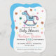 Adorável convite de chá de fraldas decorado com cavalo de balanço e pontos em rosa e azul. Fácil de personalizar com todas as informações do seu Chá para amigos e familiares.
