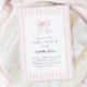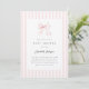 Um convite de chá de fraldas feminino sofisticado que apresenta um simples padrão de stripe rosa e branco, um arco rosa fofo. Para a aparência texturizada apresentada escolha o tipo de papel "Laid".