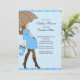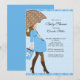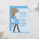 Comece seu doce chá de fraldas de bebê com nossa mãe moderna, segurando um guarda-chuva de bolinhas castanho e azul sobre um fundo de bolinhas azul. Visite nosso compro para uma grande seleção de convites para um chá de fraldas de bebê.