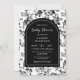Este belo e elegante convite para chás de fraldas apresenta um antigo padrão negro de Chinoiserie. O texto combina o script manuscrito e as fontes serif para uma aparência na moda e moderna. Isto é perfeito para um primavera ou chá de fraldas de jardim de verão.