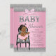 Chá de fraldas rosa e prateado com adorável menina africana-americana vestindo um tutu rosa bonito e uma corda de pérolas sentadas em uma cadeira branca e preta em um elegante fundo rosa e prateado brilhante. Este convite para chás de fraldas rosa e prateado moderno é facilmente personalizado para o seu evento simplesmente adicionando os seus detalhes no estilo de letra e na cor da sua escolha. Você pode remover a cor de fundo rosa e adicionar a cor de sua escolha. Este é um design impresso sem brilho real, arcos, etc.