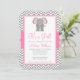 Um elefante moderno, colchete de chá de fraldas, morreu de convite. Apresentando uma ilustração fofinha de elefante e padrão de fevron em tons de rosa e cinzas. Personalize facilmente a sua festa!