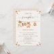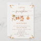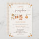Folhagem Rústica Laranja Queda Chá de fraldas de Clotheline Convite à chá de fraldas de roupa doce para o outono com algumas roupas de bebê, abóbora, botas de bebê e folhagem de outono. Este pequeno convite para chás de fraldas de abóbora também apresenta uma fonte de caligrafia decorativa e alguma folhagem nos quatro cantos.