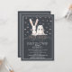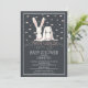 Na moda bébé gêmea convite para chá cony com flores rosa bonito colocadas em um fundo preto de quadro negro.