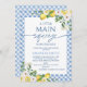Convite para Chá de fraldas de compressão principal para Lemon Amarelo Azul Limão Floral Amarelo Um pequeno convite para chá de fraldas de aperto principal com algumas flores amarelas e brancas, limões e folhagem e uma fronteira de azulejo azul mediterrânica. Ideal para primavera ou chá de fraldas de verão e pode ser usado para um bebê ou chá de fraldas neutro em relação ao gênero.