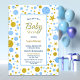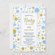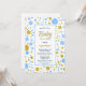 Uma estrela azul e dourada, e manchas, como um confete gigante, chá de fraldas convite para mães-serem que estão esperando um menino.