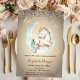 Um unicórnio bonito na lua e borboletas douradas e um confete sobre fundo dourado. Esses convites para chuveiros de bebês são facilmente personalizados para seu evento simplesmente adicionando seus detalhes.