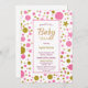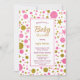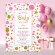 Uma estrela rosa e dourada, e manchas, como confete gigante, convite para chás de fraldas.