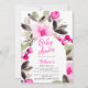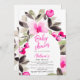 Anuncie seu próximo Chá de fraldas com nossos convites pintados à mão, com flores rosas brilhantes e bonito e charmosas e folhas verdes em aquarela, com um roteiro moderno legal e escovado. O moderno roteiro de pincel adiciona um toque de elegância a esses convites únicos que são perfeitos para qualquer celebração teatral., perfeito para o exterior e a festa do chá de fraldas de jardim. Com um quadro florescente.