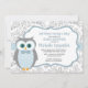 Um convite para chá de fraldas de uma coruja de cor azul para um garoto de cinza com fundo de folha de cor d'água e bolinhas.