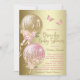 Convite para chá de fraldas de bacalhau com balões bonito cor-de-rosa e dourados com flores, borboletas e arcos sobre um belo fundo dourado. Esta unidade cor-de-rosa e dourada por convite de chá de fraldas é facilmente personalizada com os detalhes do seu evento.