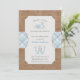 Adorável convite de chá de fraldas rústico atualizado com um cervo de xadrez doce e galhadas azuis com fundo de madeira.